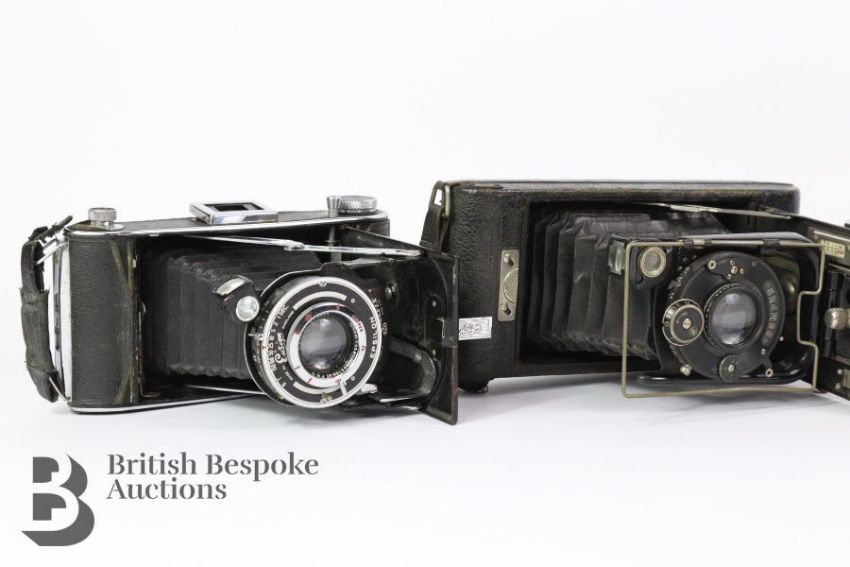 Vintage folding cameras, including an Carl Zeiss Ikon Compur Tessar 105mm 1:4.5 lens, Houghton & Butcher Carbine Compur camera Ross London lens 112 mm 1:4.5, Ensign Selfix 420 camera serial nr 9549 Ensar Anastigmatic 105 mm F4.5 lens, Ross Ensign Snapper folding camera, Kamera Werkstatten F.Deckel Munchen plate camera with Carl Zeiss Tessar 1:4.5 lens and release cable. (5)