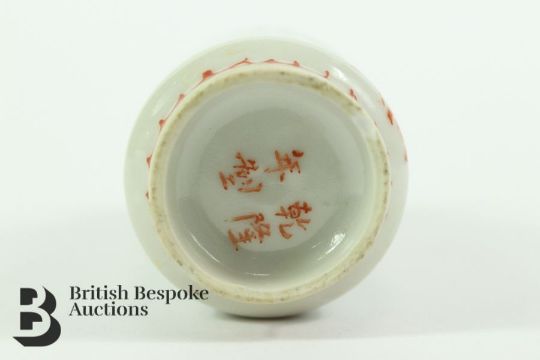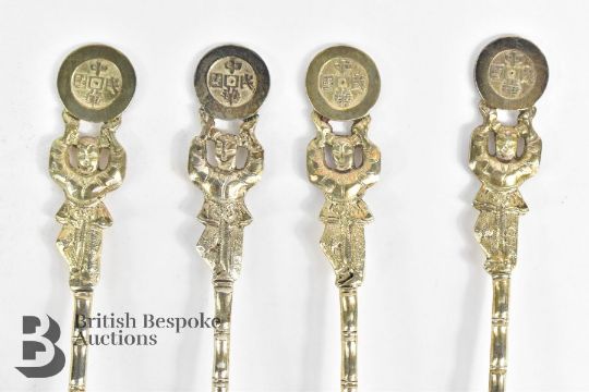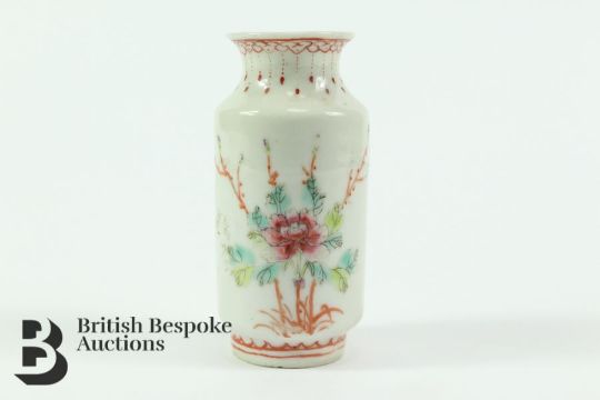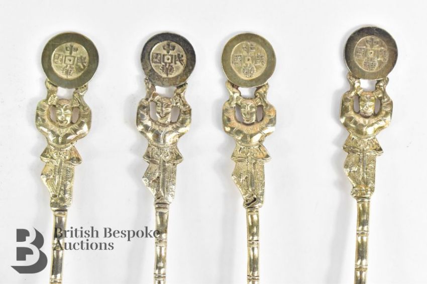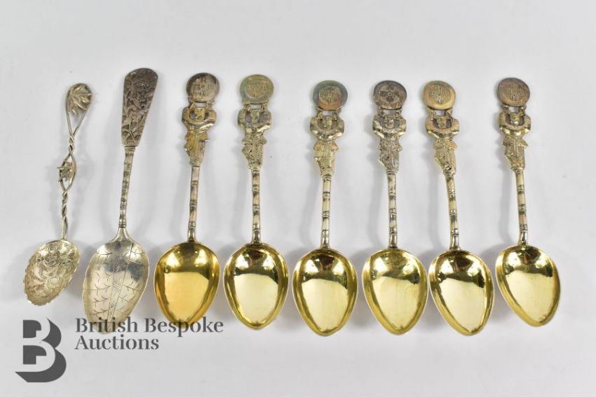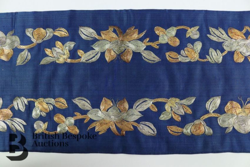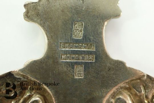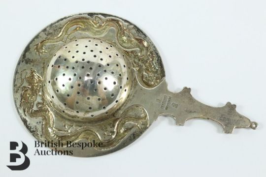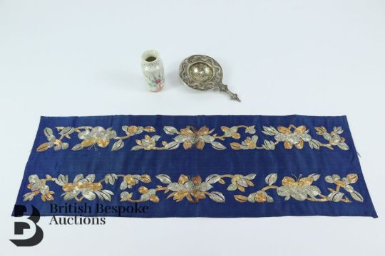 Chinese silver tea strainer, depicting dragon chasing a pearl of wisdom, approx 8 x 13 cms, mm Zeeschun Shanghai with Chinese character marks, approx 56 gms together with a set if Chinese silver teaspoons the stem terminating with a figure and Chinese character marks, two Chinese silver teaspoons and a  cobalt blue silk embroidery approx 53 l x 18 w cms and a miniature Chinese vase painted with peony approx 8 cms h with red character marks. (3)