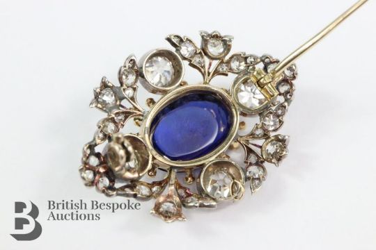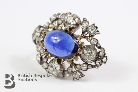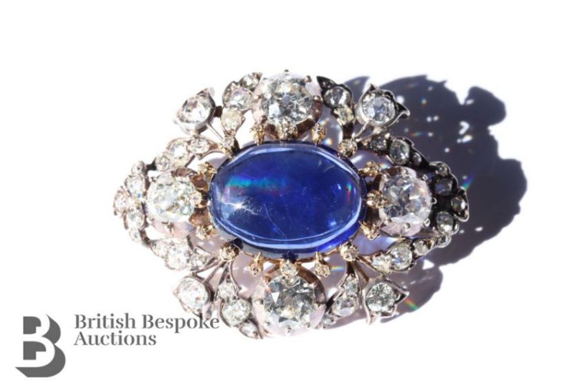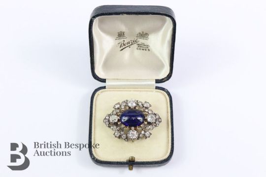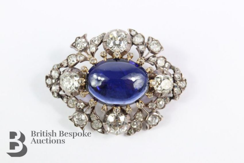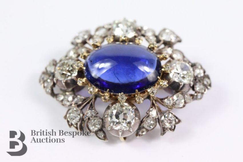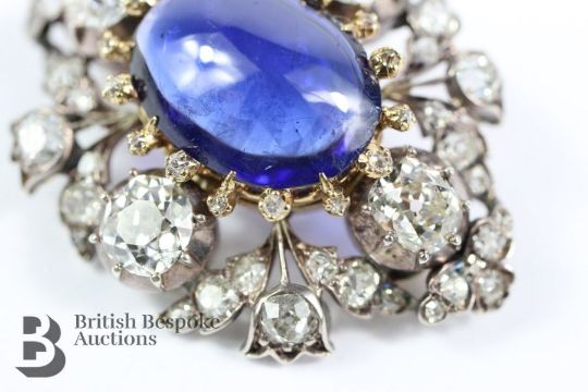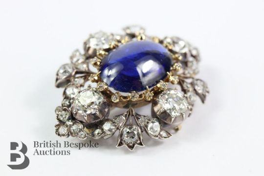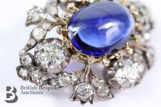 A stunning natural non heat-treated 5ct intense transparent peacock blue sapphire and diamond brooch. The central oval cabochon sapphire approx 15 x 10 x 11 mm is surrounded by four old-cut sapphires approx 60 pts each, four old-cut dias of 12 pts each and approx 1ct of smaller old-cut stones. The brooch measures approx 40 x 30 mm, 11.57 gms, complete with Pearl and Gem Laboratory certificate 20490 stating no evidence of heat treatment.