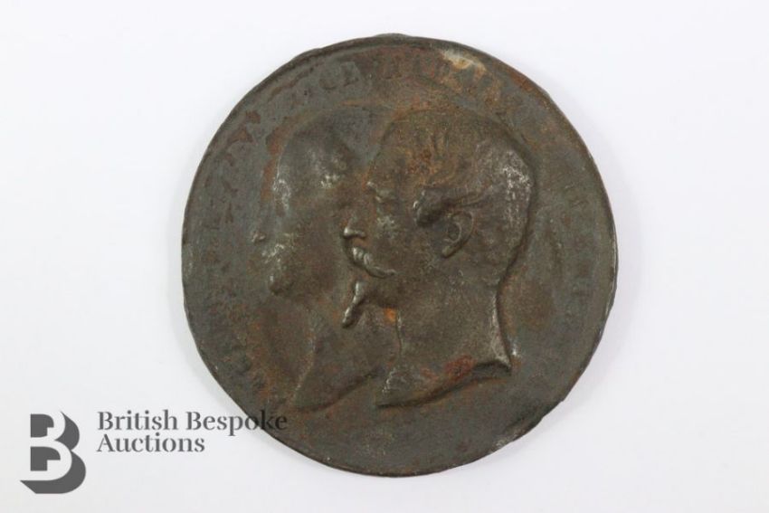 Circa 1855 France - Napoleon III - Universal International Exposition Palace of Industry Commemorative medallion. Obverse features Eugenie Imperatrice and Napoleon III Emperor facing left, the reverse depicting the vaulted galleries of the exhibition building, approx 7 cms. (worn condition)