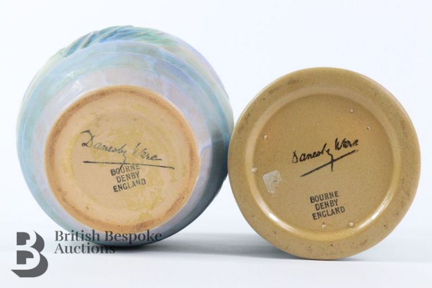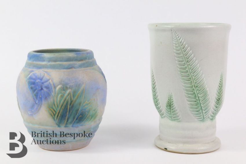 Bourne Denby Greenland vase, 'Adelaide' with delicate fern design, circa 1936, approx 18 cms h together with a Danesby pastel 'Honister' pattern vase approx 15 cms h circa 1933.