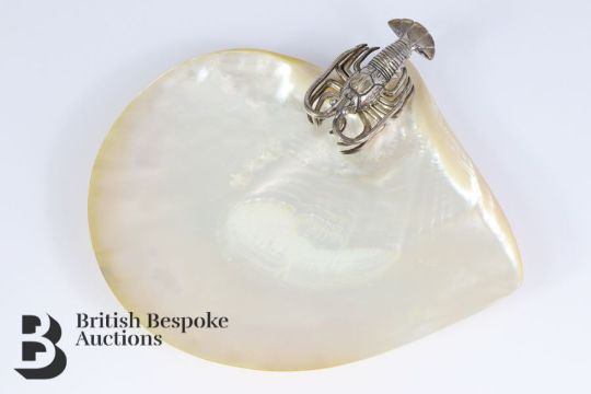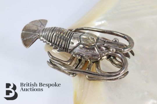 Elegant and sizeable mother of pearl shell dish, hand crafted and decorated with a silver lobster, stamped with 925, approx 17.5 x 21 x 3.5 cms, ideal for caviar.