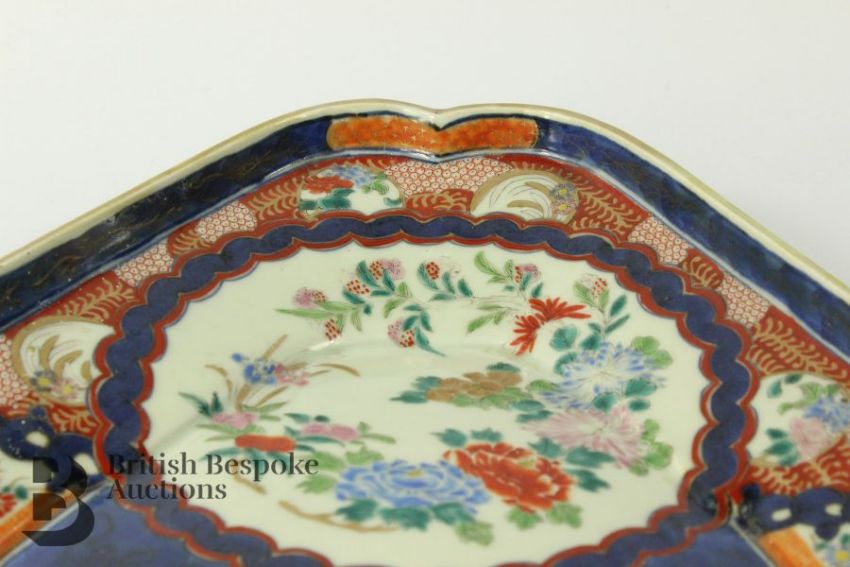 Early Meiji Japanese Imari Arita lozenge plate, approx 38 x 32 cms. The plate is painted with peony heightened with gilt. Note: There is evidence of gilding loss to the rim.