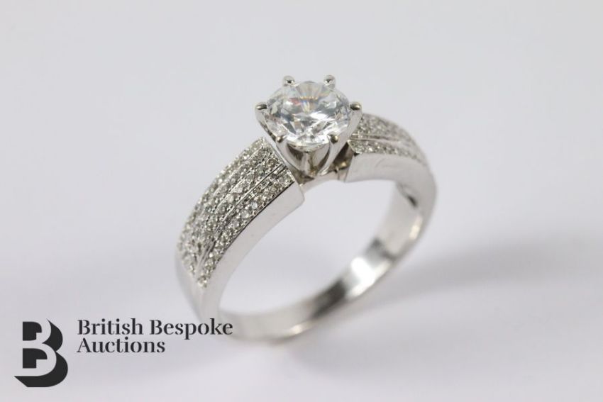 18ct white gold and cubic -zircon ring, size O+, approx 5.77 gms together with a white-metal cubic-zircon stone heart-shaped pendant.