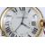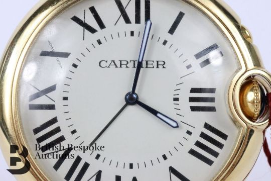 Cartier brass travel clock. The alarm clock having a white face and Roman dial and cabochon winder, approx  cms diameter. The case stamped to verso 673342. The clock having a hinged cover which works as a stand. (2)