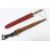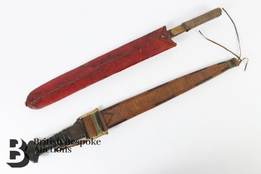 African knives, including an East African Usagara (Tanzania) Maasai short sword approx 16" rounded blade, having a stitched red leather scabbard; the second example is a hand-forged North African short sword having a blade approx 14.5" with a leather covered grip, the scabbard is finely tooled leather with the original belt loops. (2)