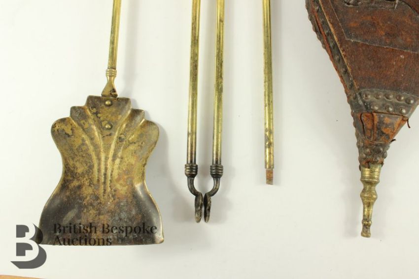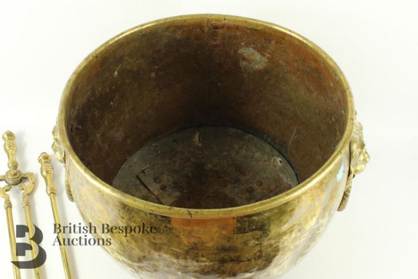 Victorian brass log basket, with lion mask handles, approx   cms, together with brass Georgian fire irons and a brass chestnut roaster.Note: poker end is missing.