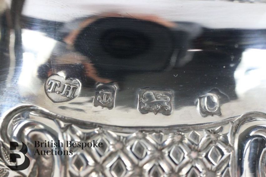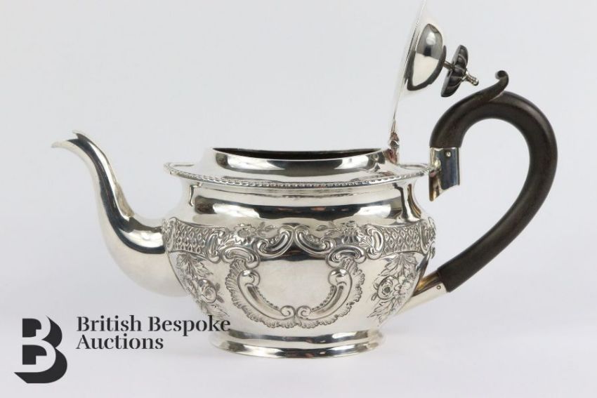 Silver bachelor tea pot, having repoussé decoration, with ebony handle and finial, approx 17 cms in length, Birmingham hallmark, dated 1902.
