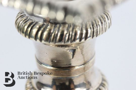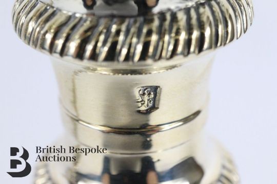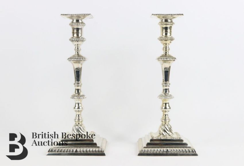 A pair of silver George III candlesticks by Ebenezer Coker, hallmarked London 1760 marks to base, and removable wax drip pans. Measures approx. h 27cms, approx. 1.4kg.