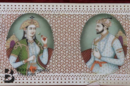 Two finely painted 19th century Mughal portrait miniatures, depicting a Maharajah and his consort, each portrait measures approx 7 x 9.5 cms. The portrait miniatures are surrounded by an ivory lattice-work frame approx 25 w x 12.5 cms h. (af)Note: the ivory lattice work frame has suffered a significant crack this affects the primary portrait near the lower right extremity.