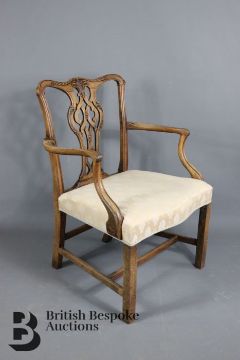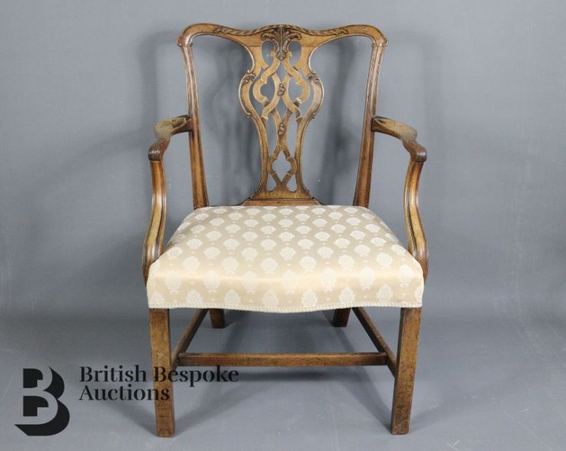 A 19th Century mahogany arm chair, faded upholstery and frame.