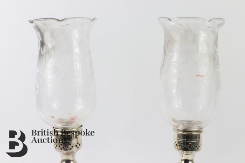 A pair of silver hurricane lamps, with acid-etched glass shades, mm G & Co Ltd dated 1976, approx. 920 gms excluding glass (filled base).