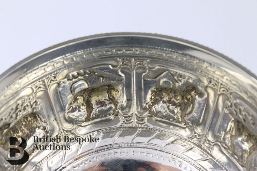 Victorian silver christening bowl, of circular form, embossed with animals including horse, lion, elephant and dog, approx 12 cms diameter x 7 cms h, London hallmark, dated 1873, mm Barnard & Sons.