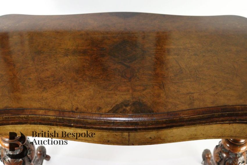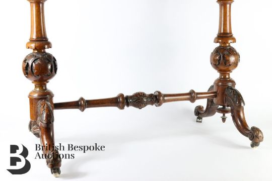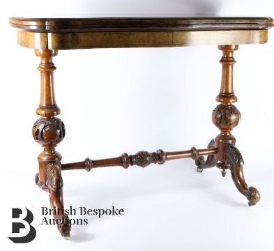 Victorian walnut walnut card table, approx 97 x 51 x 74 h cms. The table having decorative inlay with green baize card playing field, supported by elegant baluster columns and united by turned stretchers.Note: some signs of use to the table top.
