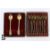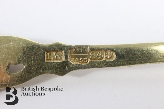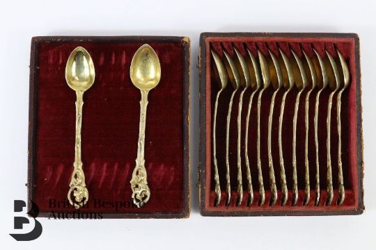 Boxed Russian tea spoons, St Petersburg silver gilt 84 (875/1000) makers mark Logan Warjus, together with two matching spoons 210 gms. Note: The terminal to one matching spoon is dented and the hinges of the box are both missing.
