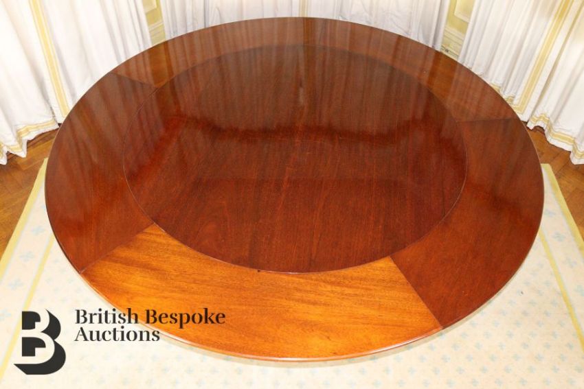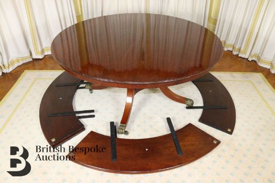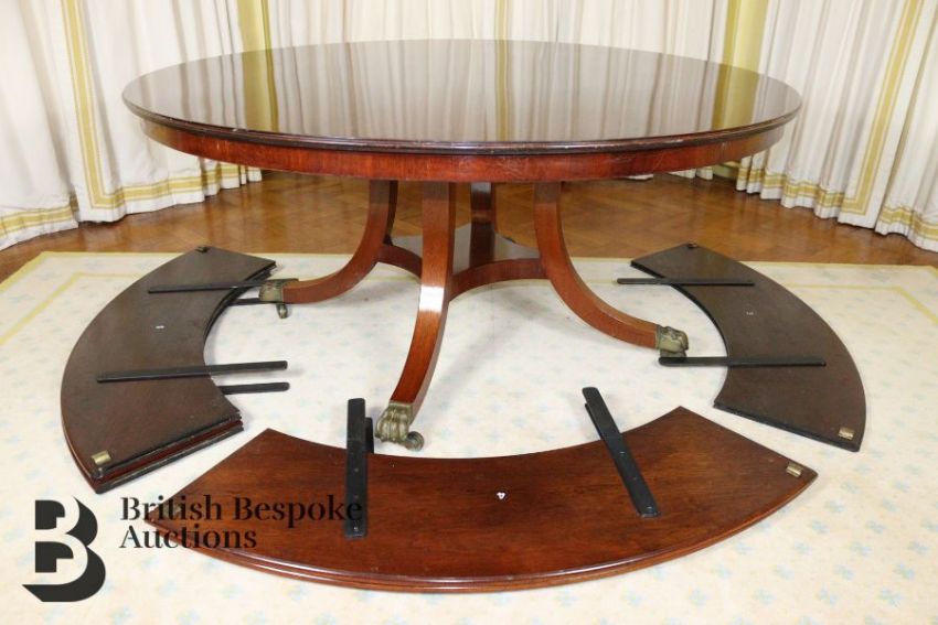 20th century Regency-style dining table, circular top with outer band of four leaves, supported on four out swept section legs, approx 225 cms (fully extended) and 155 cms (without leaves). Note: in very good condition, with high polish finish.