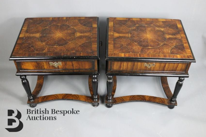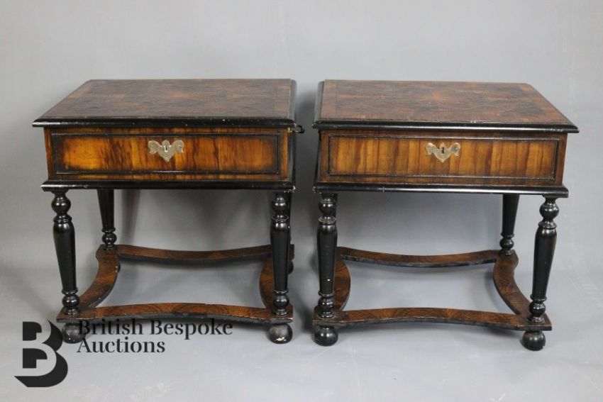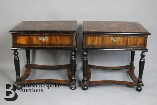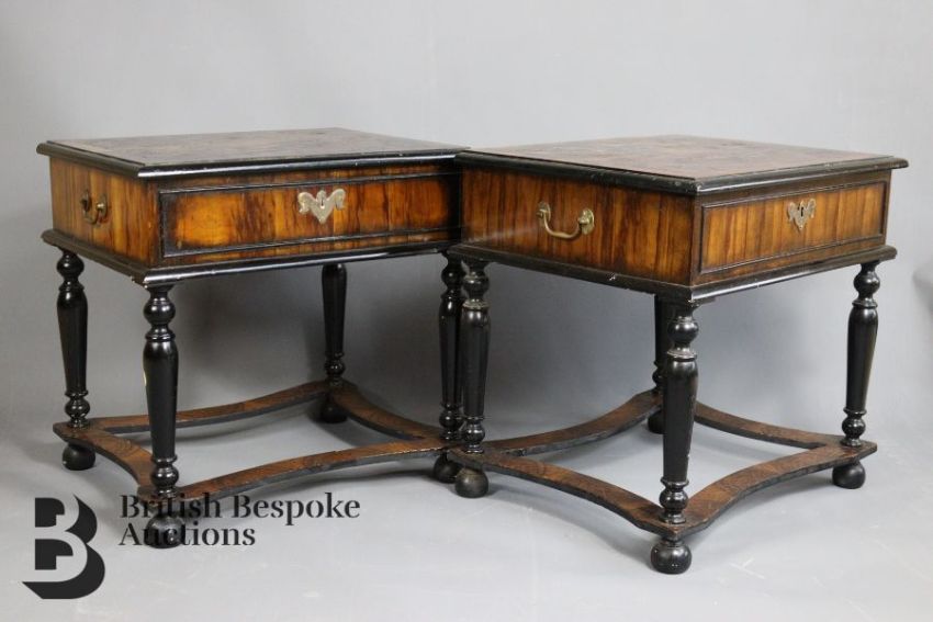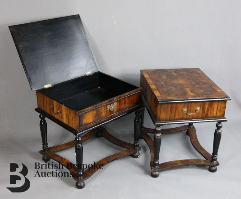 A pair of 20th century olive wood & ebonised low tables, in late 17th Century style, both take the form of table cabinets, measures approx. w 44cm x h 52cm. Note: one of the lids is loose, both have crazing to vaneers, some chips to the base.
