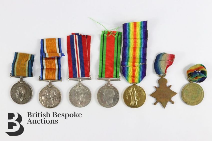Miscellaneous medals, including WWI 1914-1918 George V medal awarded to 33834 Sjt Claud Jacob and The Great War for Civilisation awarded to Sjt Claud Jacob North N.R. The WWII Defence medal 1939-1945 and George VI medal (un-named), single sergeants cloth stripes, Northamptonshire Gibraltar Talavera cap badge, together with another WWI medal group including The Great War medal, 1914-15 Star 12879 PTE Rutter and the George V 1914-1918 medal Pte C.Rutter. This lot includes a Grenadier Guards brass motto mounted on an oak plinth, to commemorate The Grenadier Guards Broadcast October 1938.