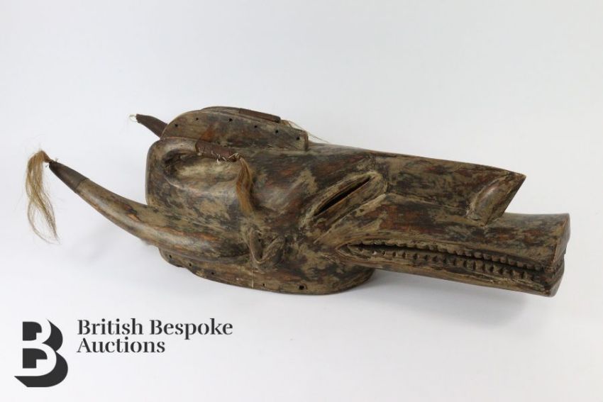 Ivory Coast Kponyungo mask. Carved from wood this mask features antelope horns. The four horns terminates with metal caps sewn with cattle hair attached with cord, between the lower horns there is a reference to the horn bill casque and the jaw is carved in the form of an elongated crocodile snout with razor teeth, approx 70 cms in length.