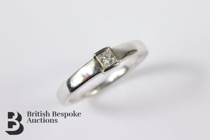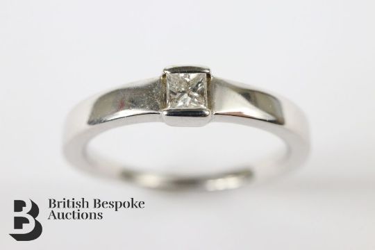 18ct white gold princess-cut ring. The ring set with a diamond of approx 15 pts, size L , approx 2.7 gms.