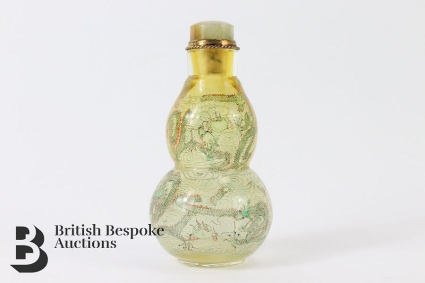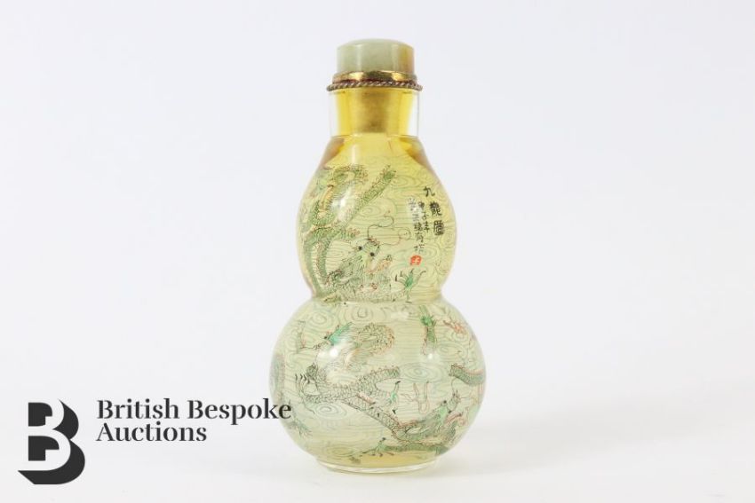 Wang Family double gourd snuff bottle, inside painted featuring dragons chasing pearls of wisdom, signed with the family seal, approx 9 cms h. This snuff bottle was purchased from the Agatha Aronson Collection California in 1988, copy of the provenance letter included.