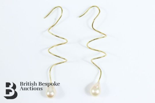 Pair of 18ct yellow gold (tested) spiral baroque pearl earrings. The pearls measure 12 x 9 mm total length approx 70 mm, approx 5.1 gms.