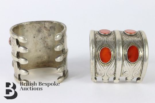Pair of silver Turkamen carnelian cuff bangles, approx 60 mm in width, approx 300 gms. Condition report: partial signs of gilding.