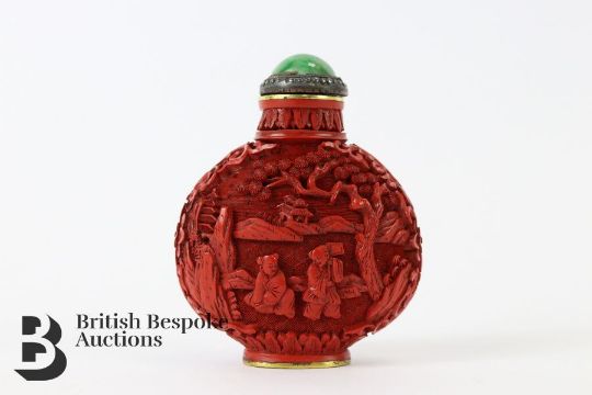 20th century cinnabar snuff bottle, finely carved with figures in a landscape setting to one side and figures in a courtyard to the other, approx 6.5 cms h, signed.