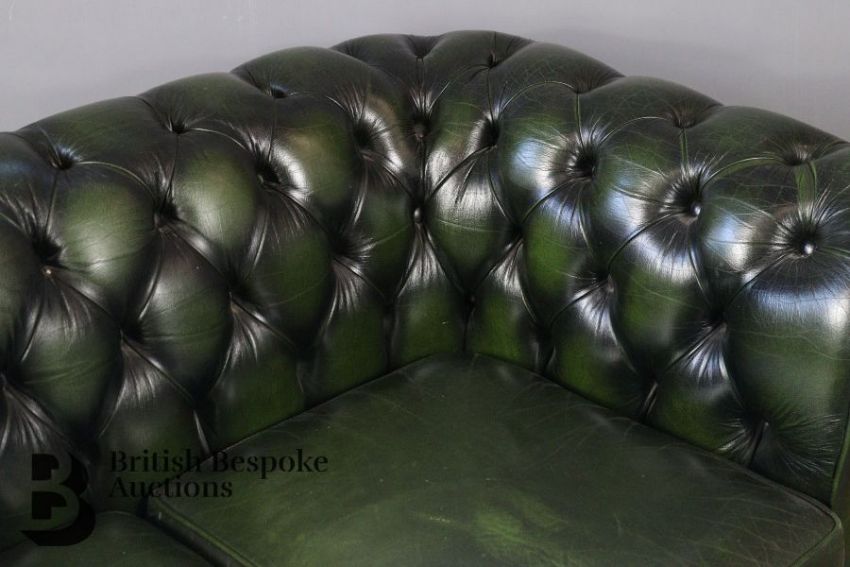 Green leather two seater button back sofa, approx 160 cms length x 89 cms. (af)The leather is in good condition however the front foot is missing.