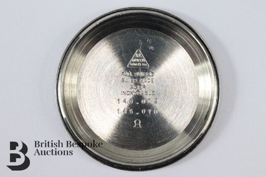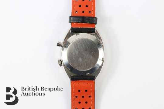 Omega Chronostop watch, the watch having a charcoal face with baton numerals and luminescent stop watch hand. Watch moving forward and stop watch working at time of describing, watch is in good condition with light scratching and minor mark between stop button and winder.