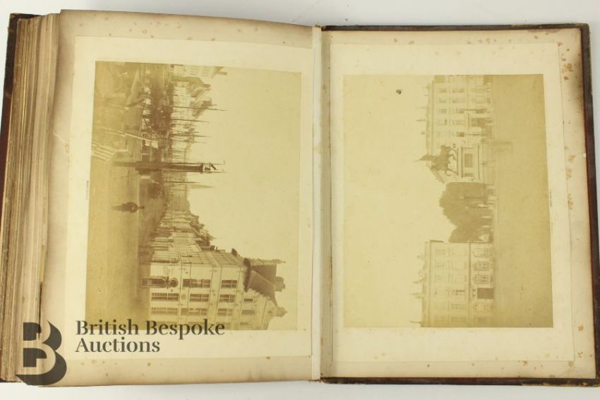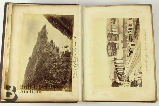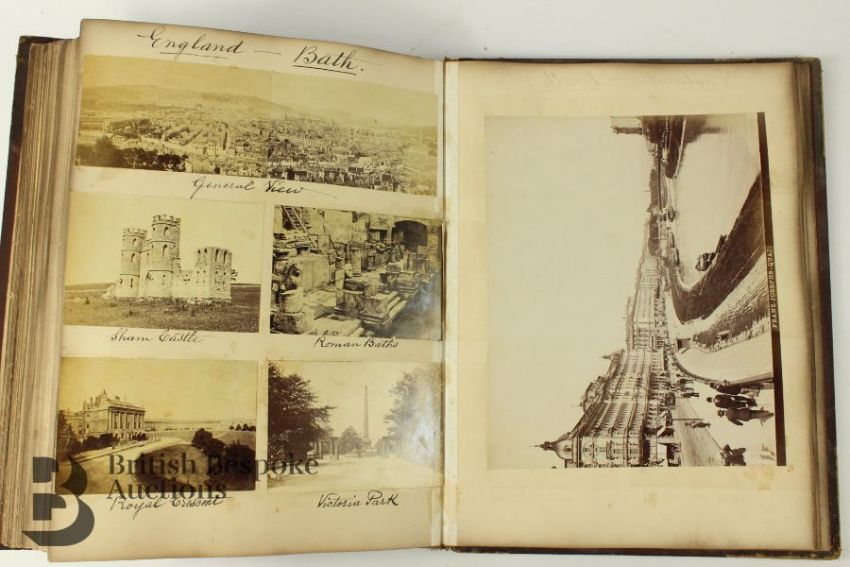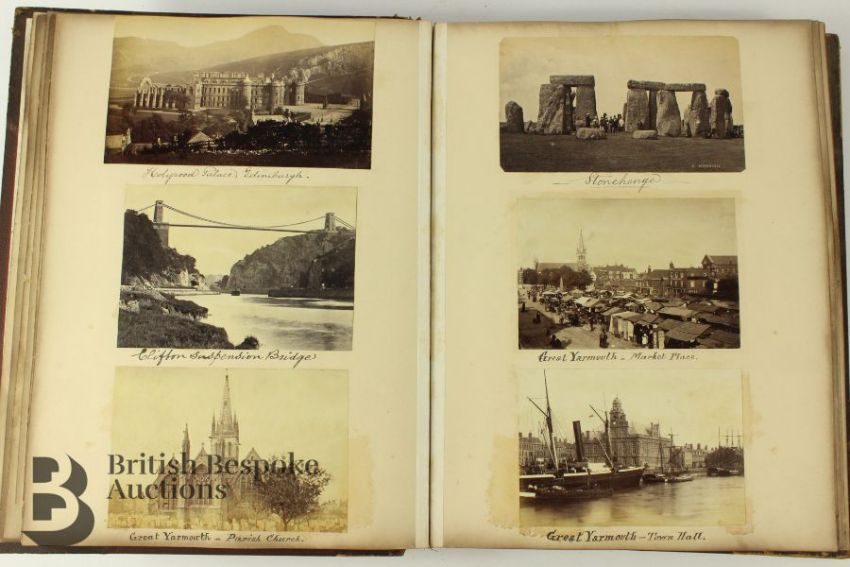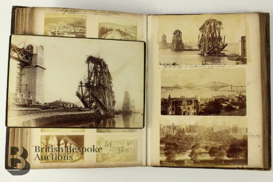 Late 19th and early 20th century photograph album. The album contains fascinating photographs some titled of Hayburn-Wyke Yorkshire; Housel Bay Cornwall, Albert Bridge Cornwall, Falmouth from the Sea, Wreck of the SS Mosel off the Lizard Aug 1822, Ventnor Isle of Wight, Holyrood Palace Edinburgh, Clifton Suspension Bridge, Stonehenge, Great Yarmouth, Scarborough, Jersey St Helier from the pier, Paris views, Paris Exhibition 1889 Machine Gallery, Spanish photographs entitled 'Siege of Bilbao 1873-74 Battery in the Cemetery of Mallano and Siege of Bilbao 1873-74 Battery of Morro; Bilbao various; Barcelona various; The Forth Bridge under construction and complete; Sussex various; Robin Hood Bay various; Berlin various; Bath; Alpine Chasseurs; amongst others, approx 150 images.Note: This album belonged to the gentleman who was involved with the laying of telegraph lines under the sea between Bilbao and The United Kingdom and thus down through the family.