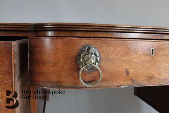 A George IV mahogany side board. The side board having a bowed centre with an inscription above a napery drawer, with two cellarette drawers raised on ring-turned tapered legs, measures approx. w 132cm x 93cm h
