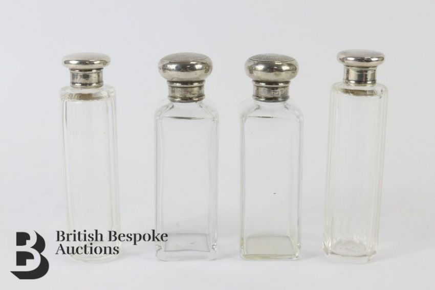 Four silver-topped vanity bottles, two square bottles with London hallmark, mm Mappin & Webb dated 1927; two circular bottles dated 1916. (4)
