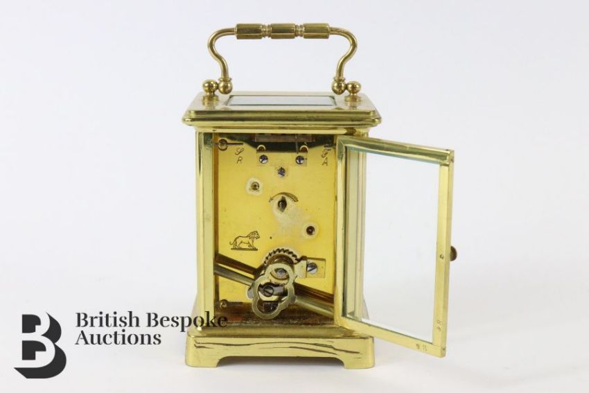 French carriage clock. The clock having a white enamel face with Roman dial 8 x 11 x 6.5 cmsNote: the clock has a hairline crack to the upper left extremity.