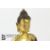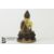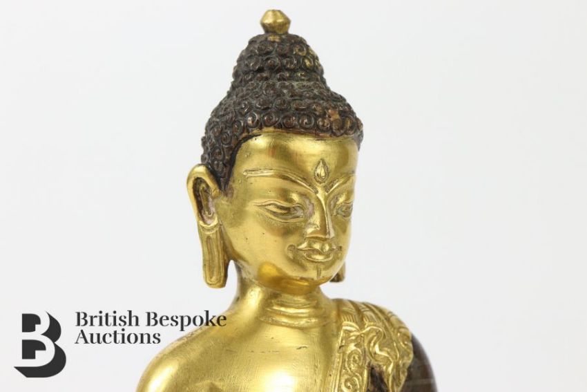 A gilt-bronze buddha Chinese or Tibetan, depicted seated in dhyanasana, his left hand resting upon his lap in dhyana and lightly touching the lotus base with his right hand. His bronze robe is loosely draped across one shoulder and trimmed with a gilded foliate border and inlaid with silver. His hair is cast in bronze with tight curls and his facial features are gilded. The buddha is raised on a double lotus base, which is sealed beneath, we do not know if the prayer scroll is present, approx 825.6 gms, approx 16.5 cms.