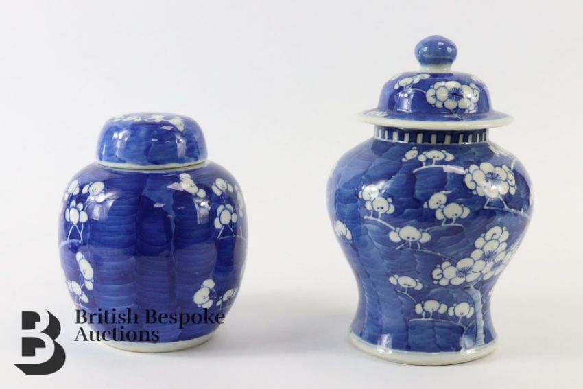 Late 19th century Chinese ginger jar and cover, painted with prunus blossom approx 17 cms h together with a baluster ginger jar and cover painted with prunus blossom, approx 22 cms h. (2)