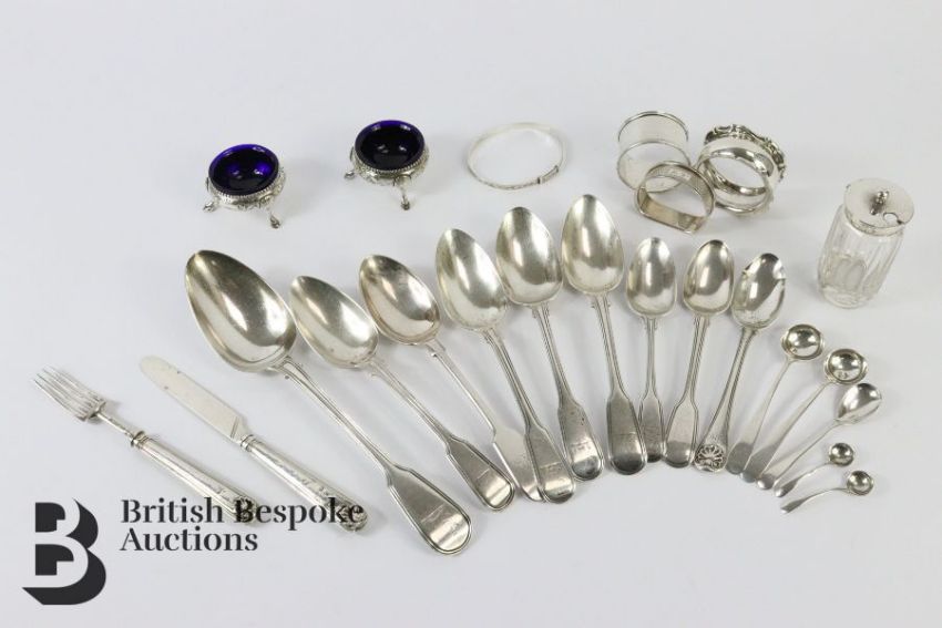 Quantity of silver spoons, including a large serving spoon, two table spoons and a tea spoon, London hallmark dated 1819, two table spoons London hallmark dated 1808 mm T.D, a tea spoon London hallmark dated 1844 mm WE, a silver tea spoon Sheffield hallmark dated 1881, a silver fork Sheffield hallmark dated 1828 mm AH MH&Co, a silver knife Sheffield hallmark dated 1857 mm MH&Co, a silver napkin ring Birmingham hallmark dated 1905 mm ACM Co., a silver napkin ring Birmingham hallmark dated 1956 mm B&Co, and one other napkin ring Sheffield hallmark dated 1878, two small silver salt spoons and two silver mustard spoons, a sterling silver christening bracelet, plus a silver plated spoon, two white metal cruets with glass liners and a white metal and glass mustard. Silver weight approx 500 gms.