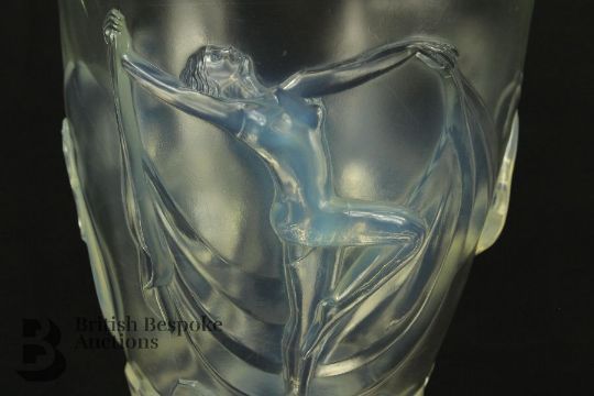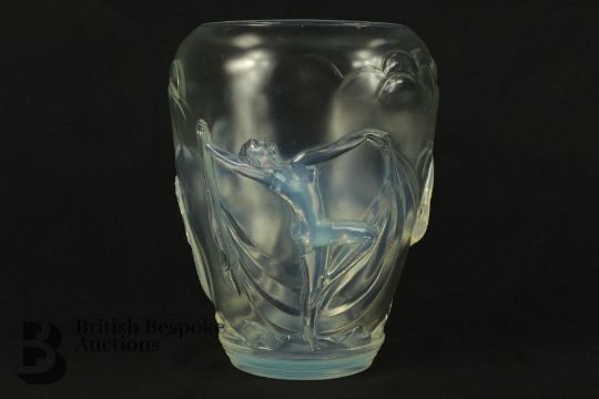 Verlys France opalescent glass vase, modelled with posing Art Deco figurines, signed, approx 21 cms h.