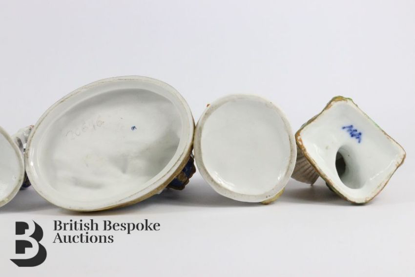 Five Continental porcelain figurines, comprising two spill vases with finely painted features mm MA , furthermore this lot includes other figurines include Dresden and a Royal Dux figural group (Reveil), all with slight damage, each measuring approx. h 18 cms.