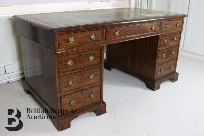 Mahogany pedestal desk, circa 1900. The desk having a rectangular tooled green leather top, above three frieze drawers, twin pedestal base with three drawers to either side, raised on bracket feet, approx 152 w x 75 cms h. Note: faded leather top.
