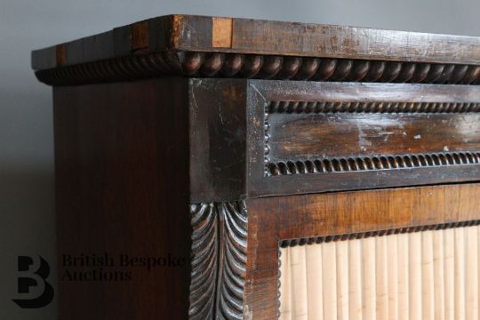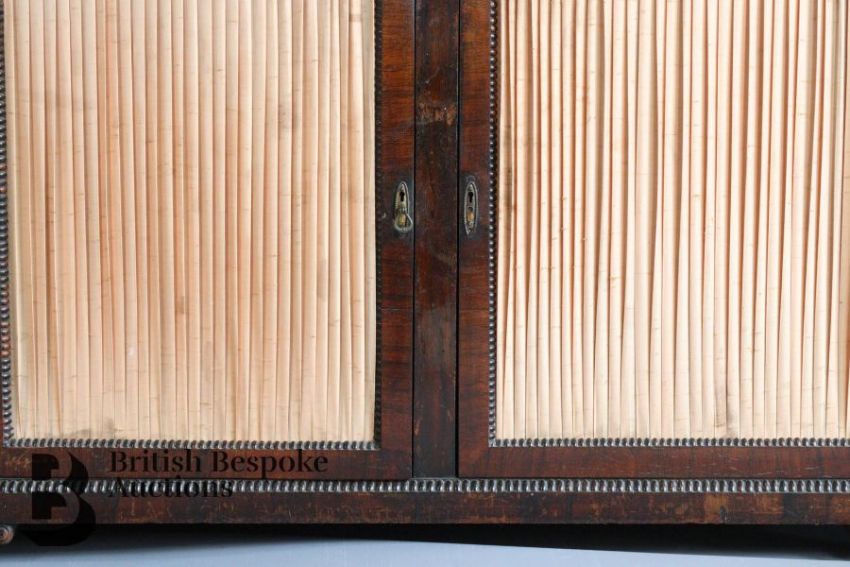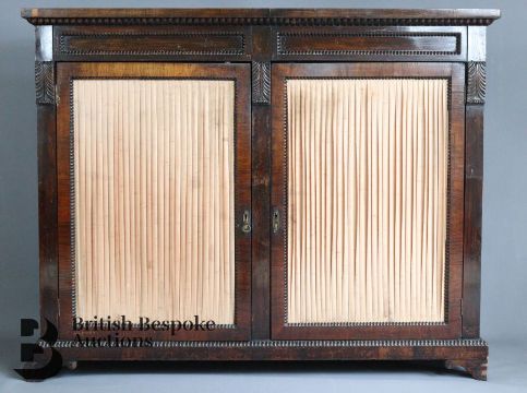Early Victorian rosewood side cabinet, rectangular top, panelled doors lined with pleated silk flanked by pilasters stood on a plinth, raised on bracket feet, approx 122 w cms x 97 cms. Note: some inlay missing and damage apparent to the right foot (part missing).