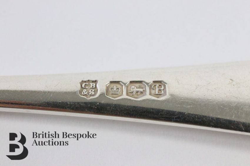 Twelve silver rat tail Hanoverian dessert spoons, including eight Sheffield hallmark dated 1969 mm Cooper Bros & Sons; two London hallmark dated 1893 mm William Gibson & John Langman, one London hallmark dated 1890 and one London hallmark dated 1876 mm Daniel & John Welby, approx 600 gms.