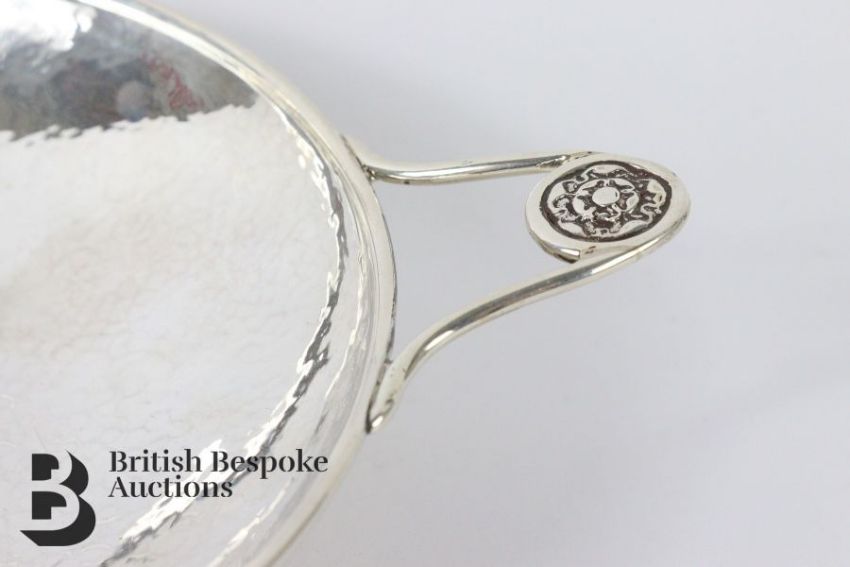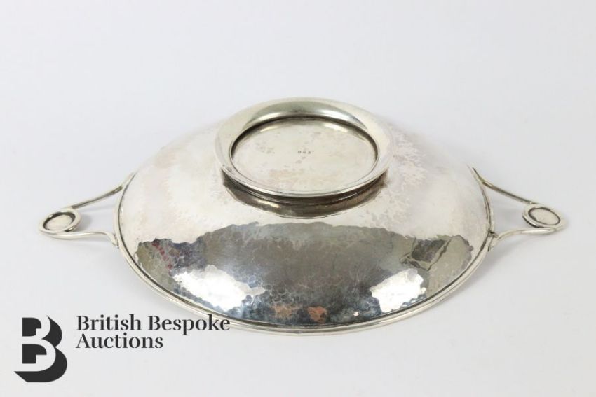 Arts and Crafts twin-handled bowl, of circular form, hammered finish, with two wire handles with rose decoration, raised on a circular foot, approx 25.5 cms handle to handle, approx 167 gms.