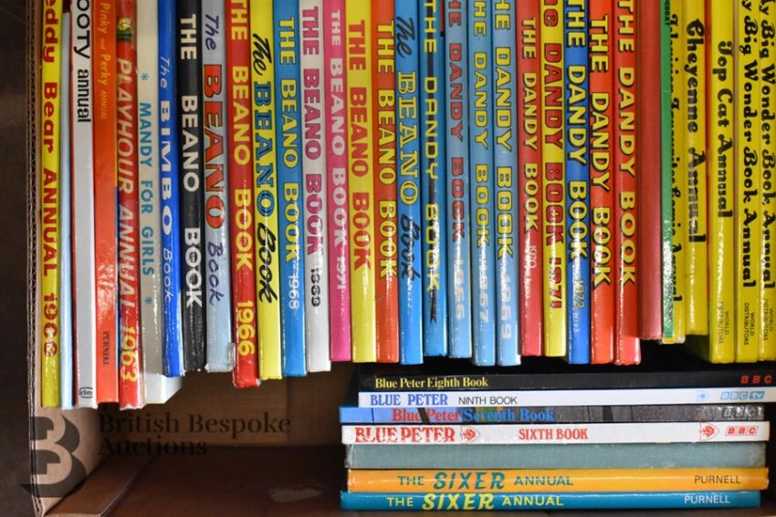 Approx. 75 children's annuals 1960 and 1970s, including 10 Beano annuals, 9 Dandy, 10 Beezer plus topper, Schorcher, Marvel, Fantastic, 3 Sixer Cub Scout, Rupert 1965 and 1966 (magic paintings neatly completed), all from 1 well kept collection in nice clean condition.