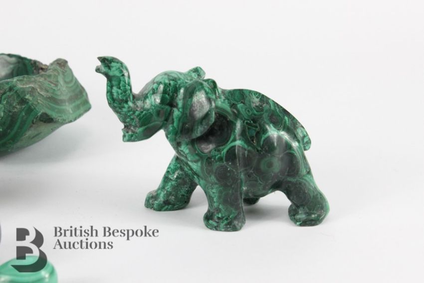 Quantity of malachite, including the following cats, hippopotamus, bear (af), hippo, three rhinoceros (af), elephant, lion (af), together with sixteen of eggs and a piece of rough malachite.