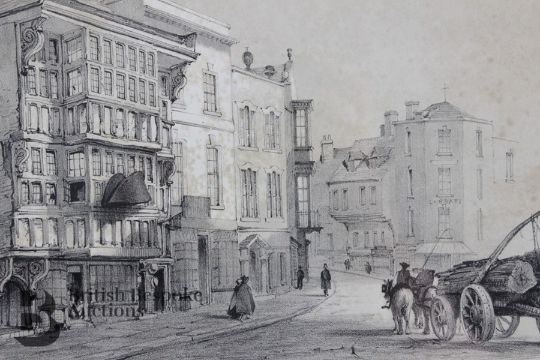 G.Rowe lithograph entitled Ancient House Church Street Tewkesbury, the wagon featured is where the Town War Memorial stands today, approx 27 w x 20 h cms, framed and glazed.