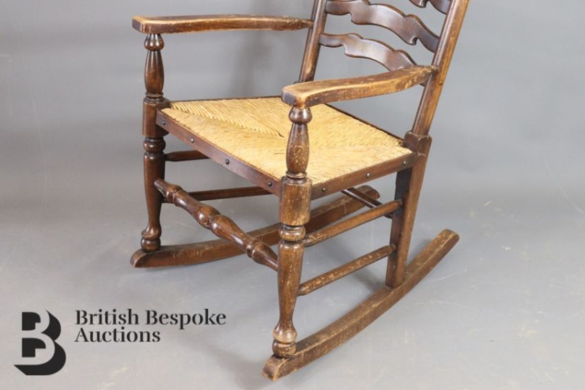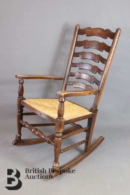 An oak ladder-back rocking chair, with rush seating, approx 56w x 65 d x 97h cms.