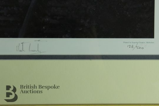 Large limited edition lithograph signed print by John Austin 128/500 of The Flyer at Cheltenham Spa St James, April 2004 with certificate of authenticity to verso, framed and glazed, print 49.7 x 66cms, approx 89 x 75 cms.