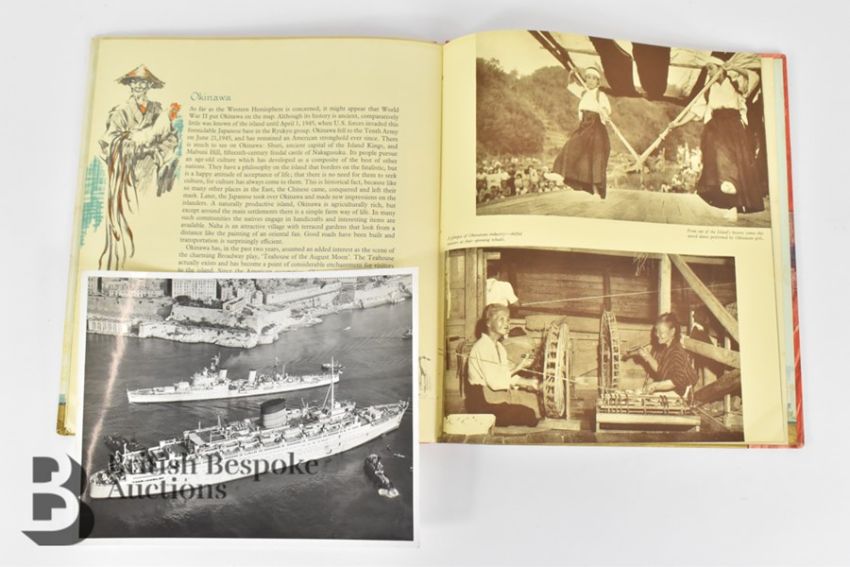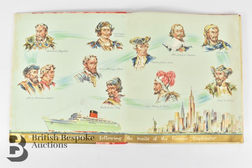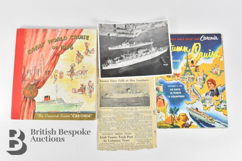 Cunard Line "Caronia" Great World Cruise of 1956; Lovely hardback Souvenir Guide for World Cruise of 1956; NY - South Africa - India- Singapore - Hong Kong - Japan - NY - 33,000 mile journey. Plus super large fold out Guide for Autumn Cruise to the Mediterranean Sept. 1955 with full Deck Plan. B&W photo.