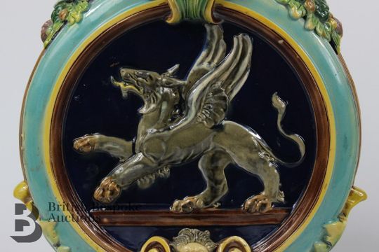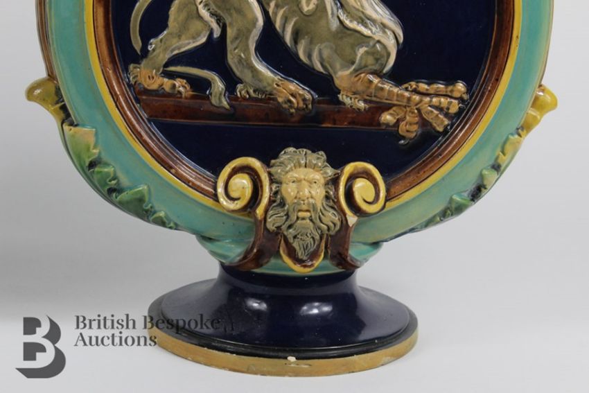 Pair of 19th century majolica moon flasks, approx 33 cms in height and 26cms wide. The vase depicting phoenix to both sides with shell and berry decoration to the shoulders.